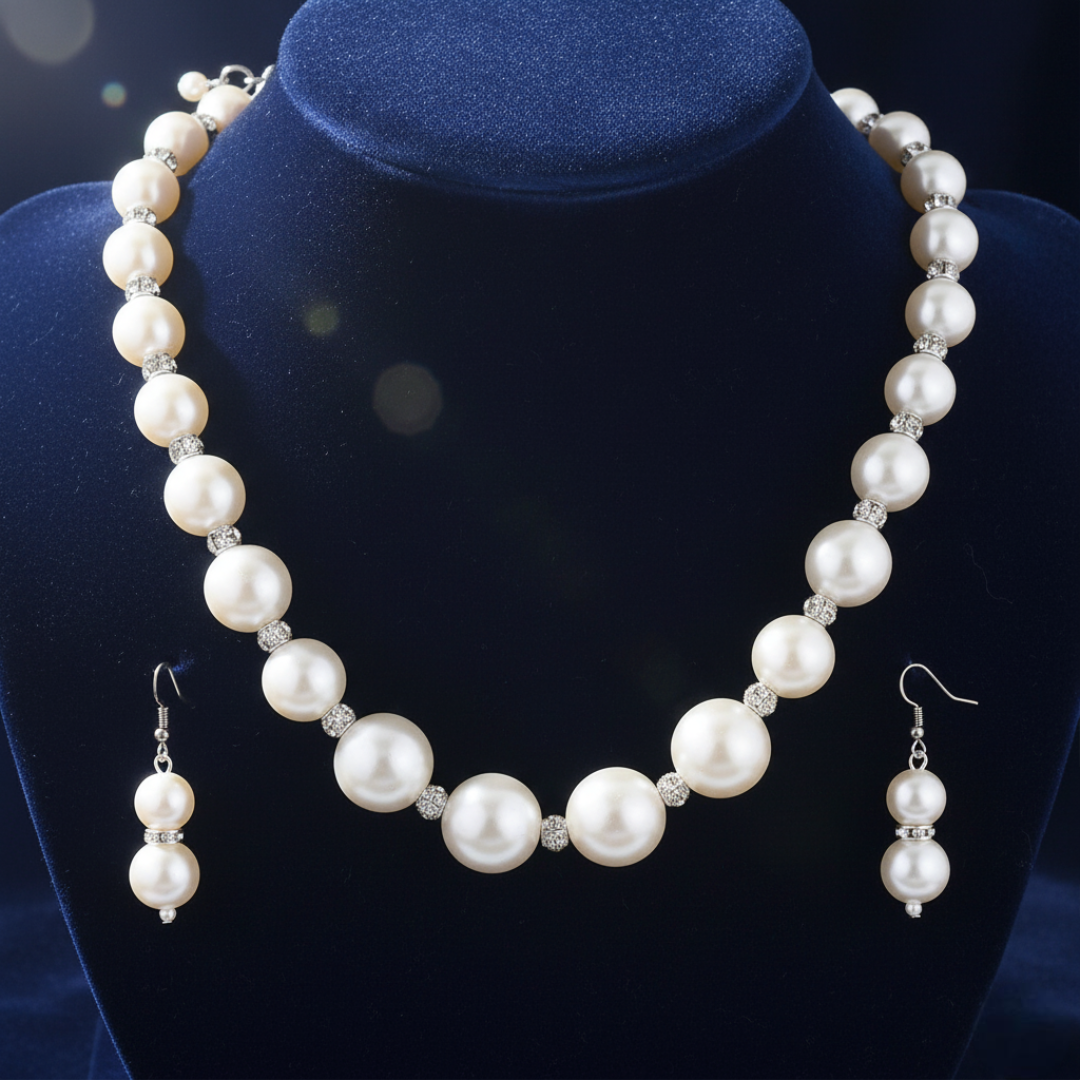 Make a timeless statement with this stunning faux pearl necklace set from Sondarya. This piece features a single strand of large, lustrous faux pearls, each separated by a delicate, sparkling silver-toned spacer. The classic design is given a modern twist with the bold size of the pearls, creating a look that is both elegant and eye-catching. The set includes a pair of matching double-pearl drop earrings, making it a complete and sophisticated ensemble.