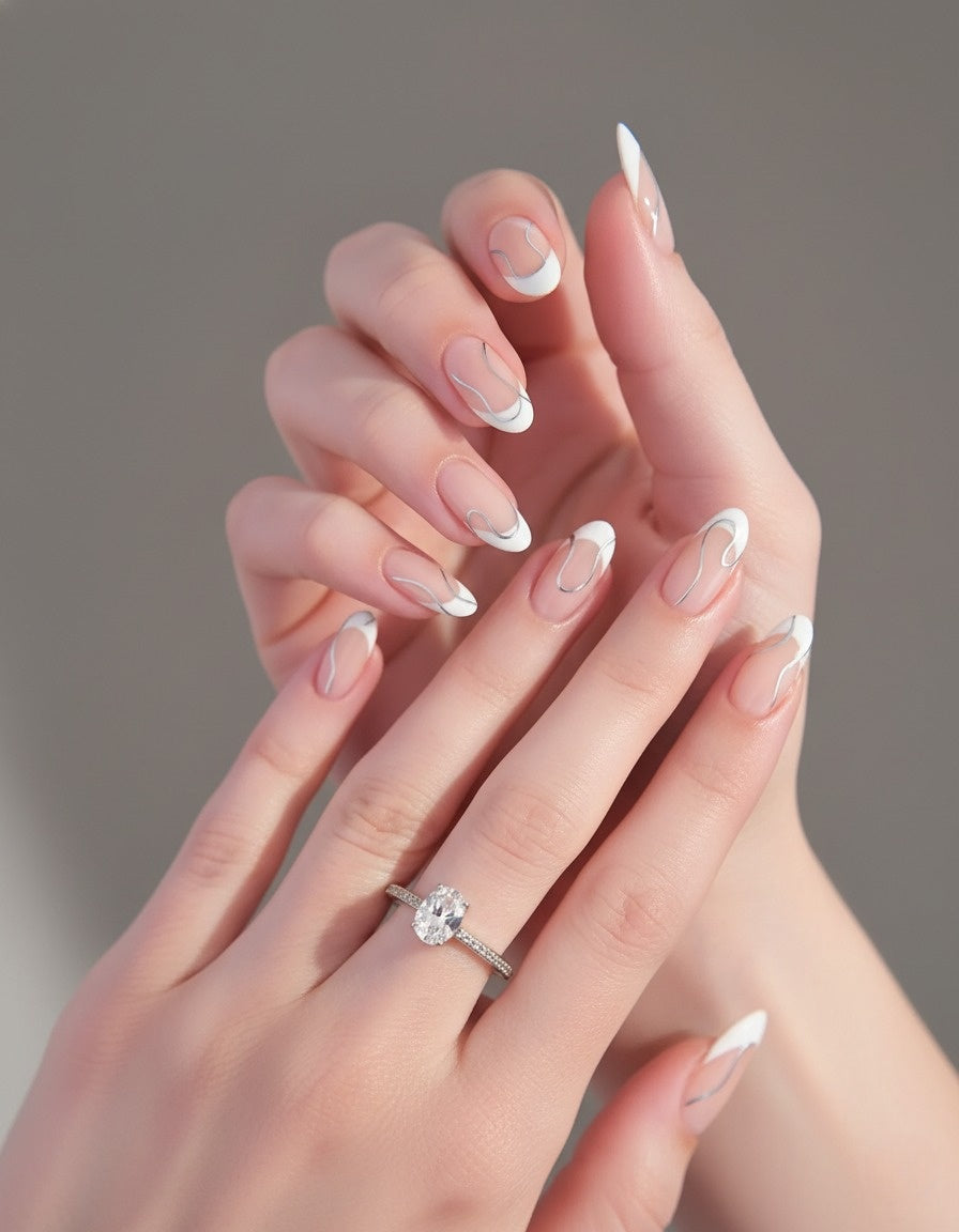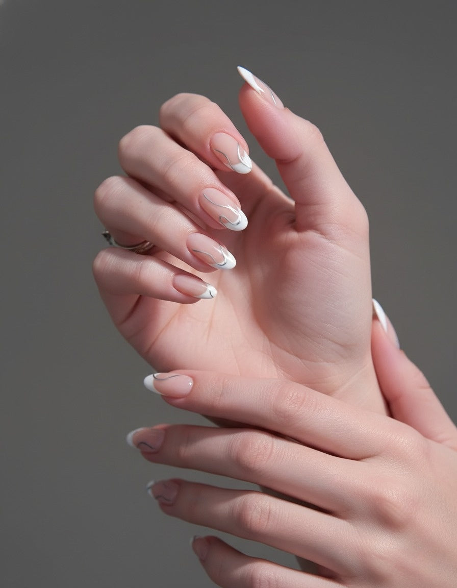 APPLIEDNude French Tip with Silver Wavy Design – Press-On Nails Kit