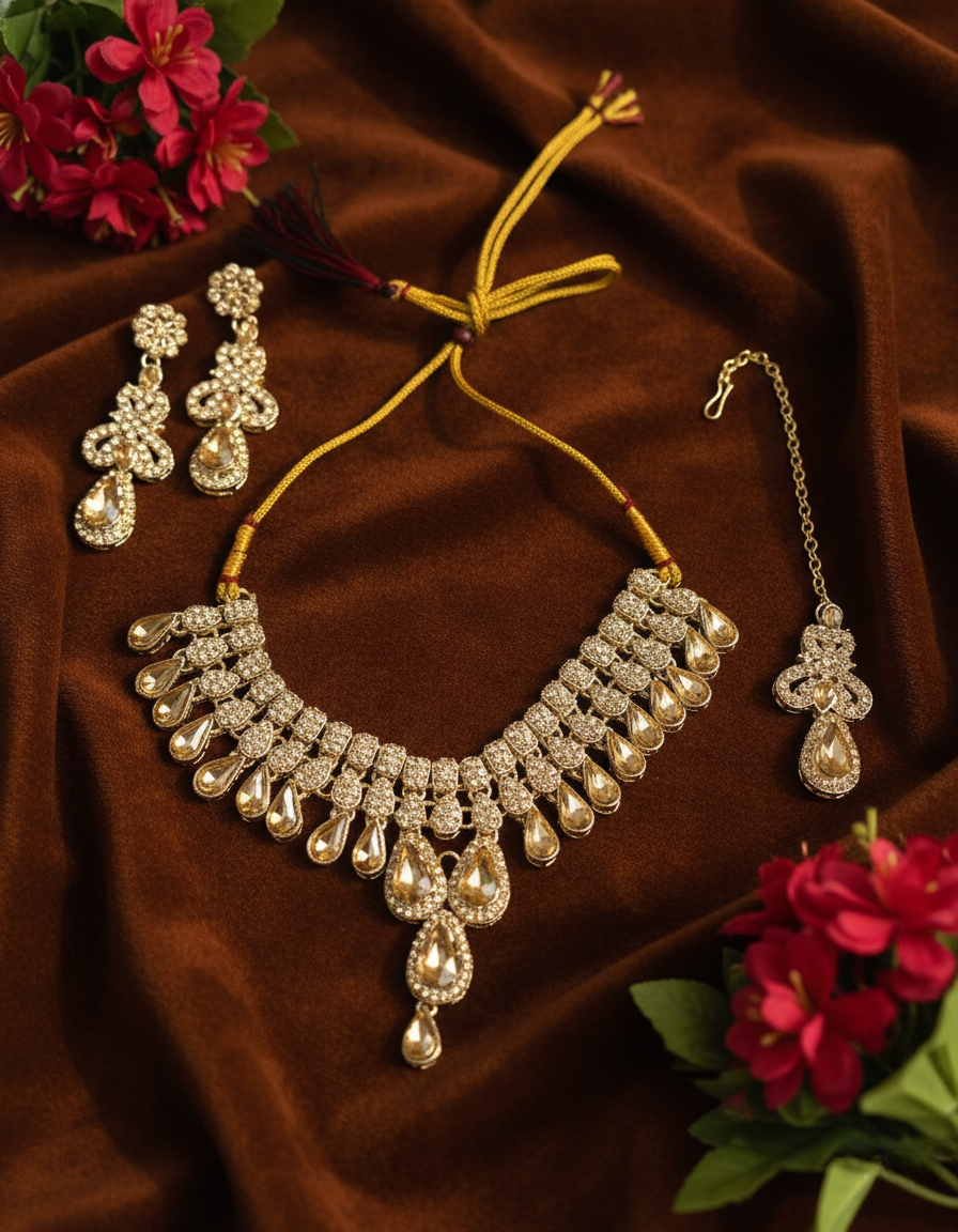 Sondarya Champagne Crystal Teardrop Necklace Set With Maang Tikka