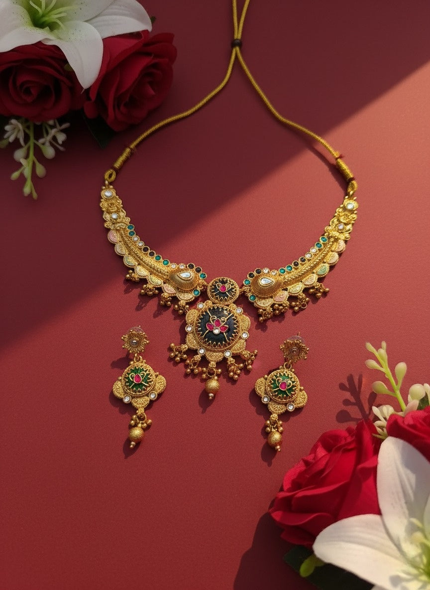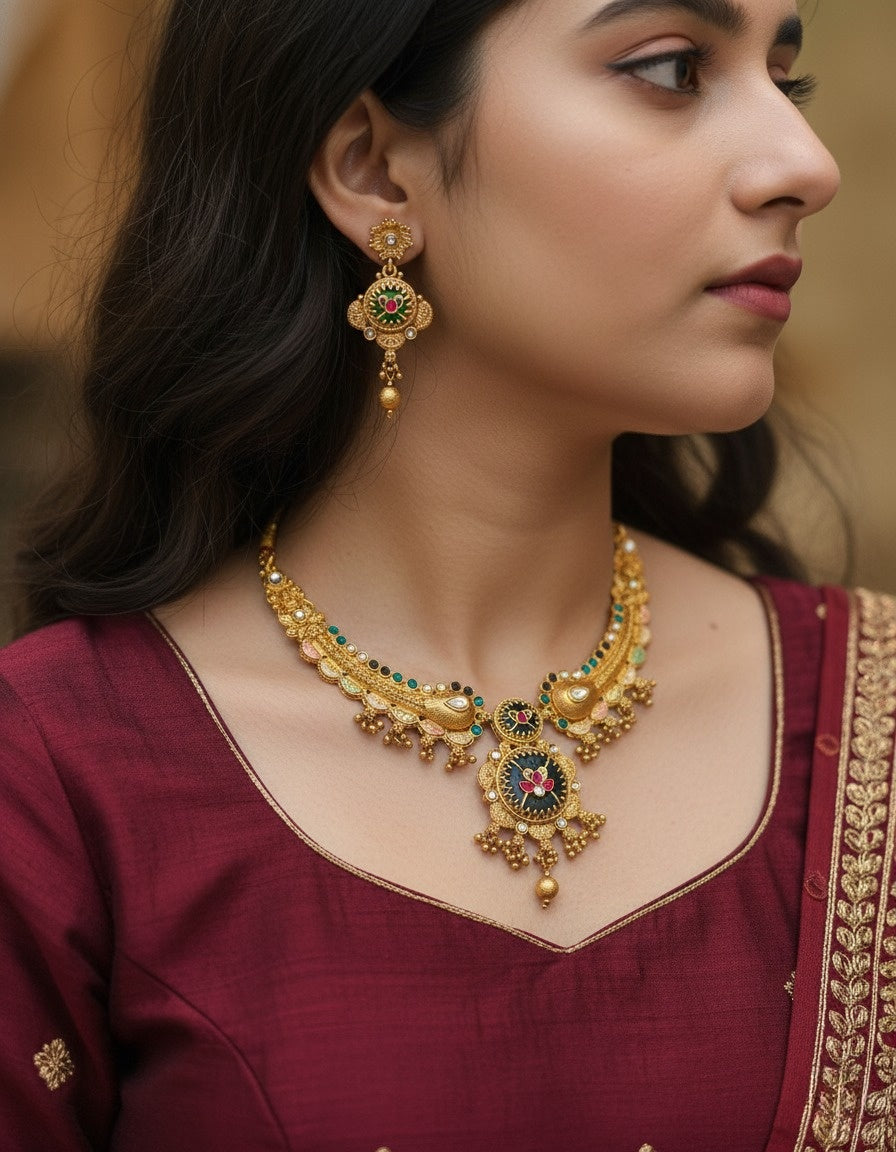 Sondarya Heritage Forest Green Enamel & Antique Gold Set With Earrings