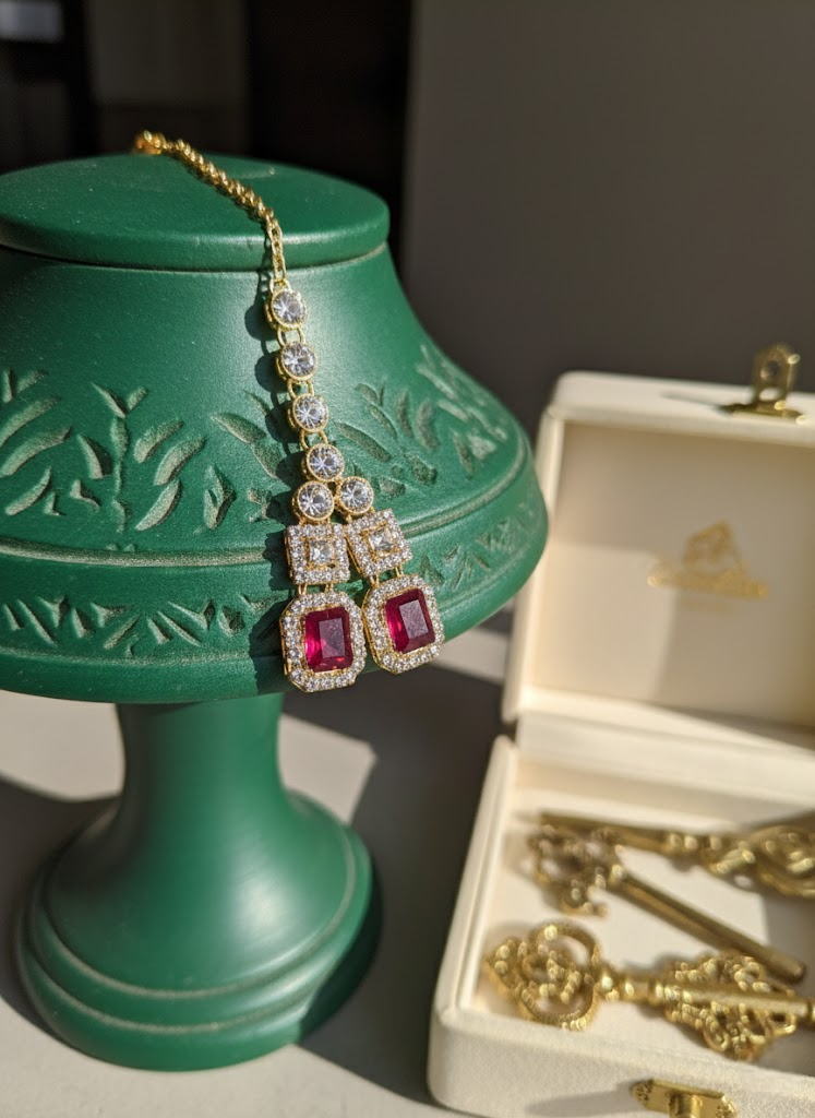 This exquisite Sondarya jewelry set captures the essence of royal elegance. The necklace features a stunning, close-fitting design, meticulously crafted with clear, brilliant diamond-look stones that frame rich, emerald-cut ruby-colored center stones. It is the perfect blend of traditional allure and contemporary craftsmanship, designed to make a statement.